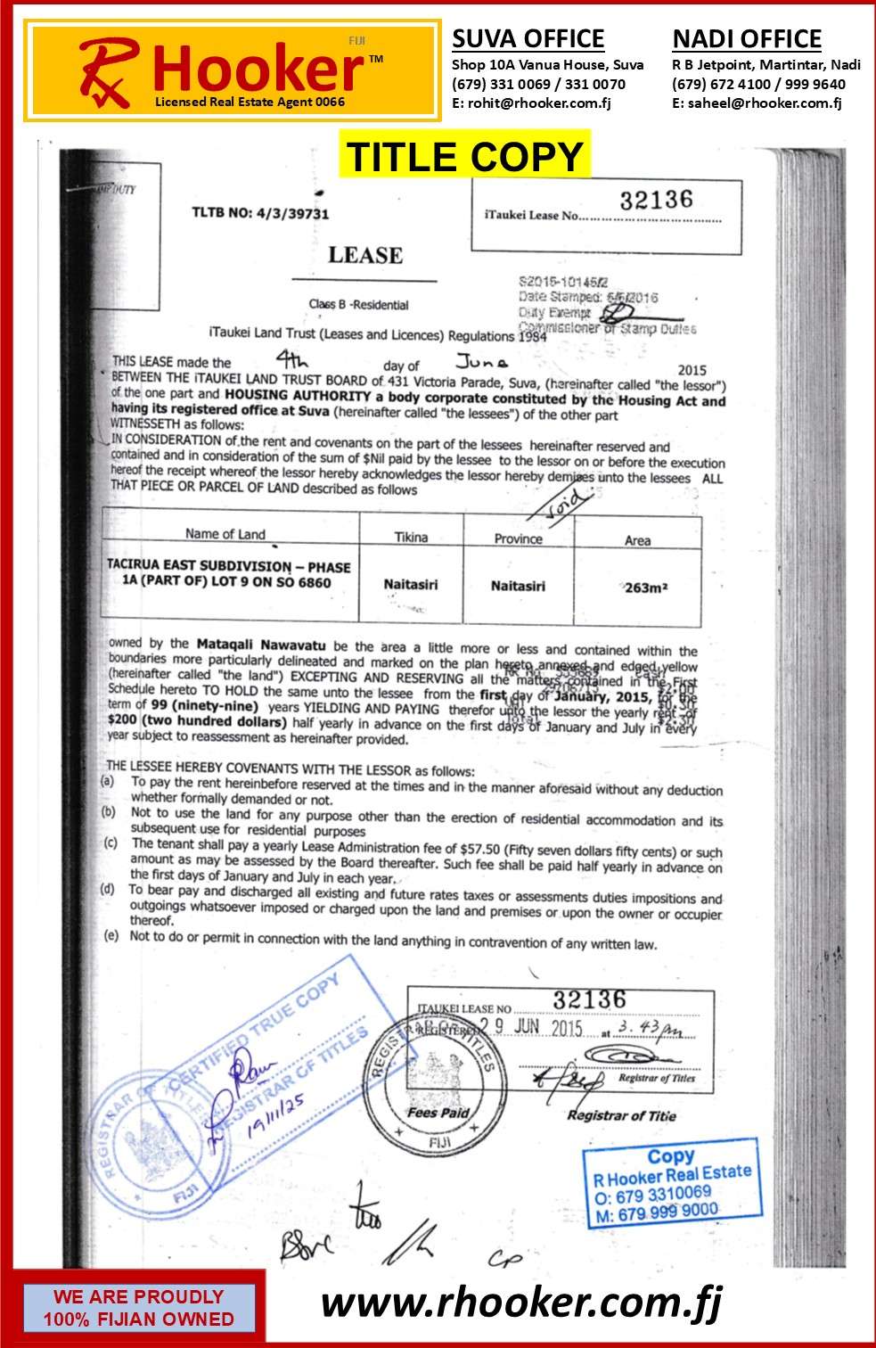 - i-Taukei Lease of 89 years remains with a land area of 263 sqm.
